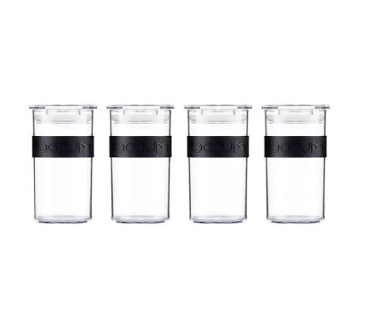 Découvrez ces quatre bocaux de conservation de la gamme Presso de Bodum. Conçues en plastique polycarbonate, ils ne contiennent aucun BPA. La bande en silicone noir marqué du logo de la marque permet d’avoir une bonne prise en main. Leur contenance est de 25 cl, ce qui permet de conserver environ 75g de café par bocal.