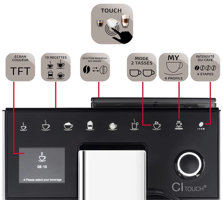 En plus de réaliser de parfaits cafés fraîchement moulus, cette machine automatique  Melitta Caffeo Ci-Touch  vous permet de réaliser des  boissons lactées  (Cappuccino, Latte Macchiato) trés facilement grâce à sa fonction One Touch et à son récipient à lait de 1L (relié à la machine via un conduit).